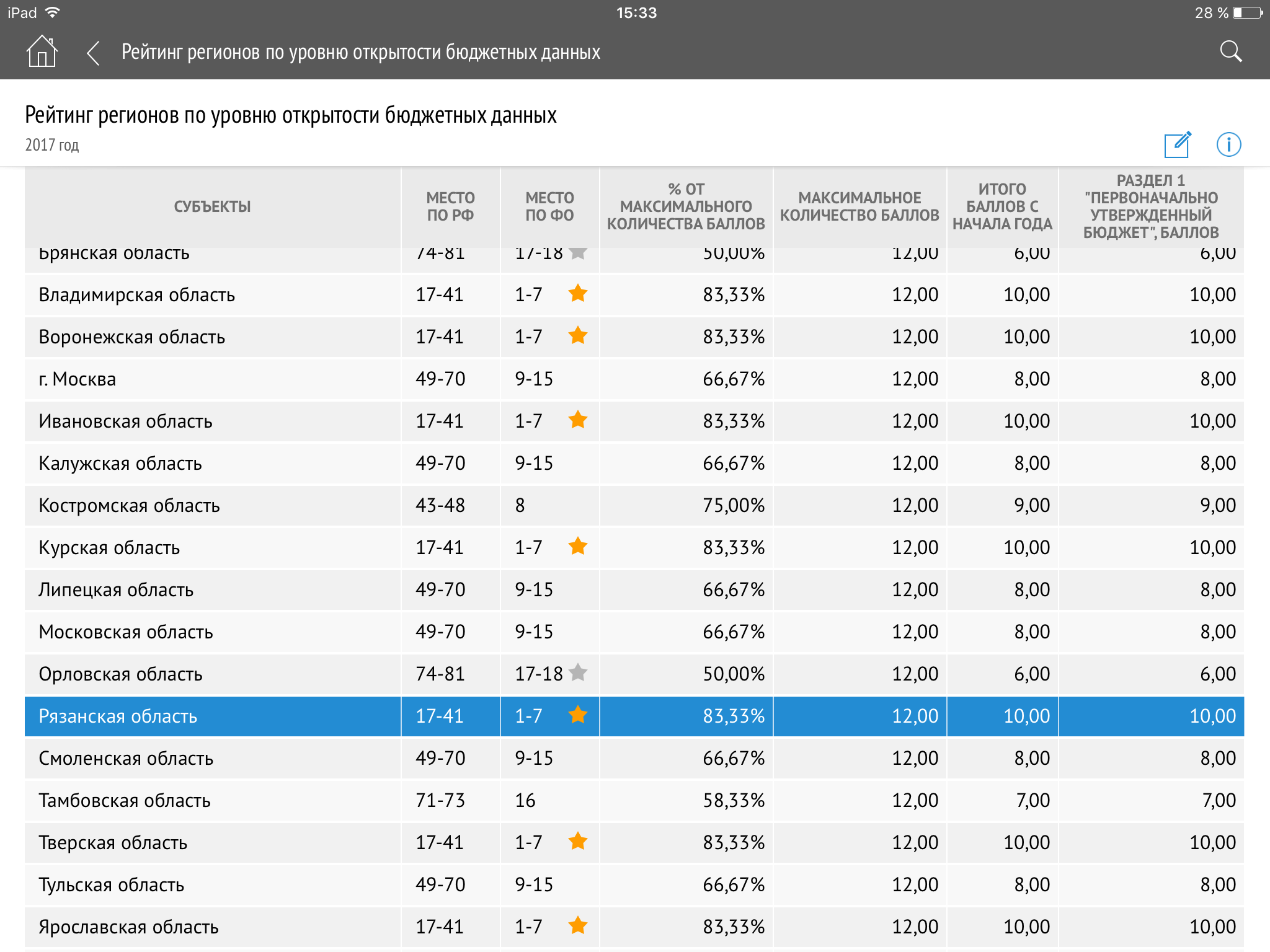 Так, по данным рейтинга, ежегодно составляемого Научно-исследовательским финансовым институтом (НИФИ) Минфина России, Рязанская область по итогам 1 этапа (февраль-апрель 2017 года) делит 17-41 место по уровню открытости бюджетных данных. Это лучший результат для Центрального федерального округа и заметный прогресс для самого региона: по итогам аналогичного периода 2015 года место было 43-48, 2016 года - 36-45 место.