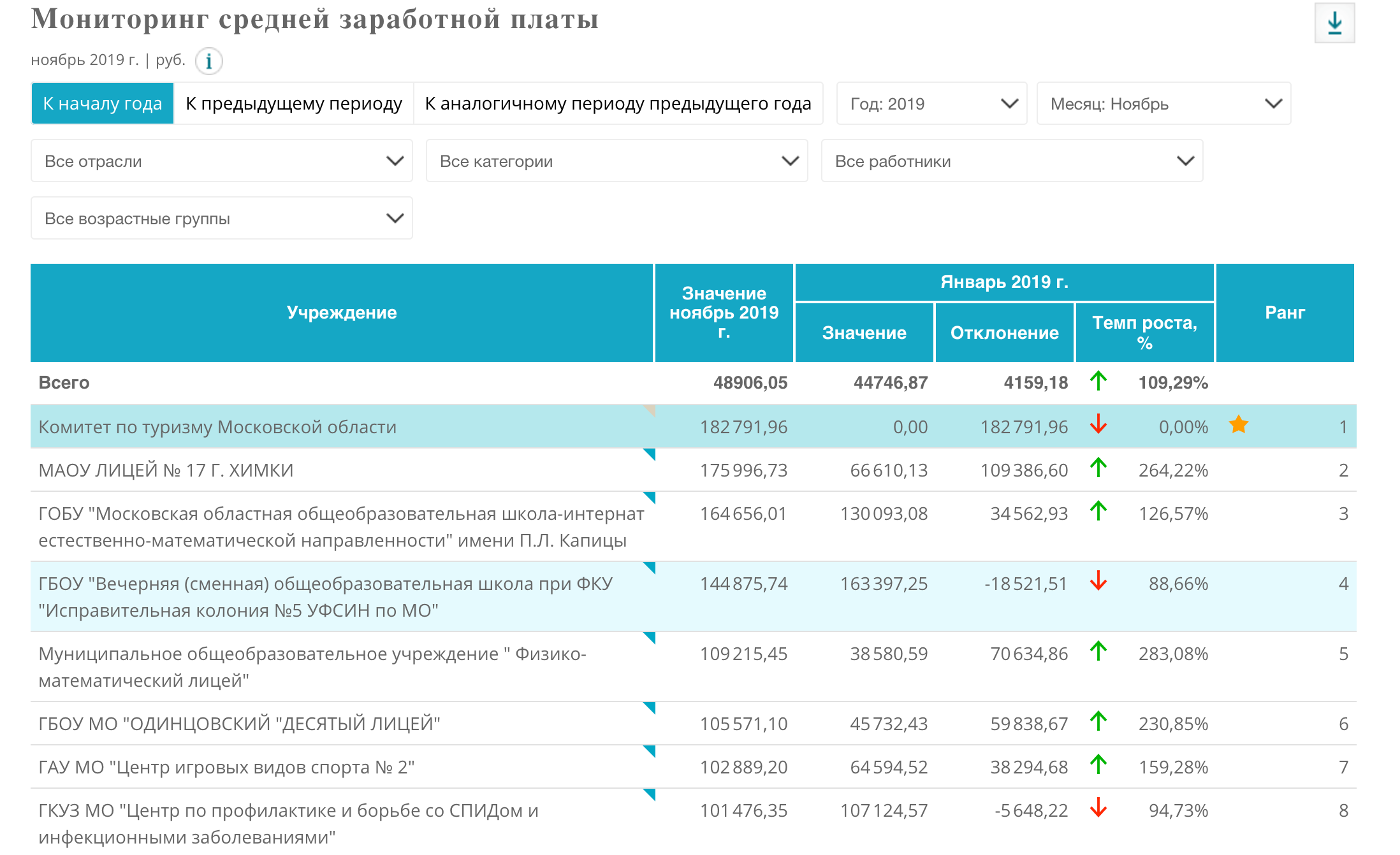 Отчет «Мониторинг средней заработной платы» позволяет сравнить величину заработной платы по различным учреждениям, определить среди них лидеров по этому показателю и узнать динамику за текущий год. Источниками информации являются формы статистической отчетности ЗП-здрав, ЗП-образование, ЗП-соц., ЗП-наука, ЗП-культура, данные обновляются ежемесячно.