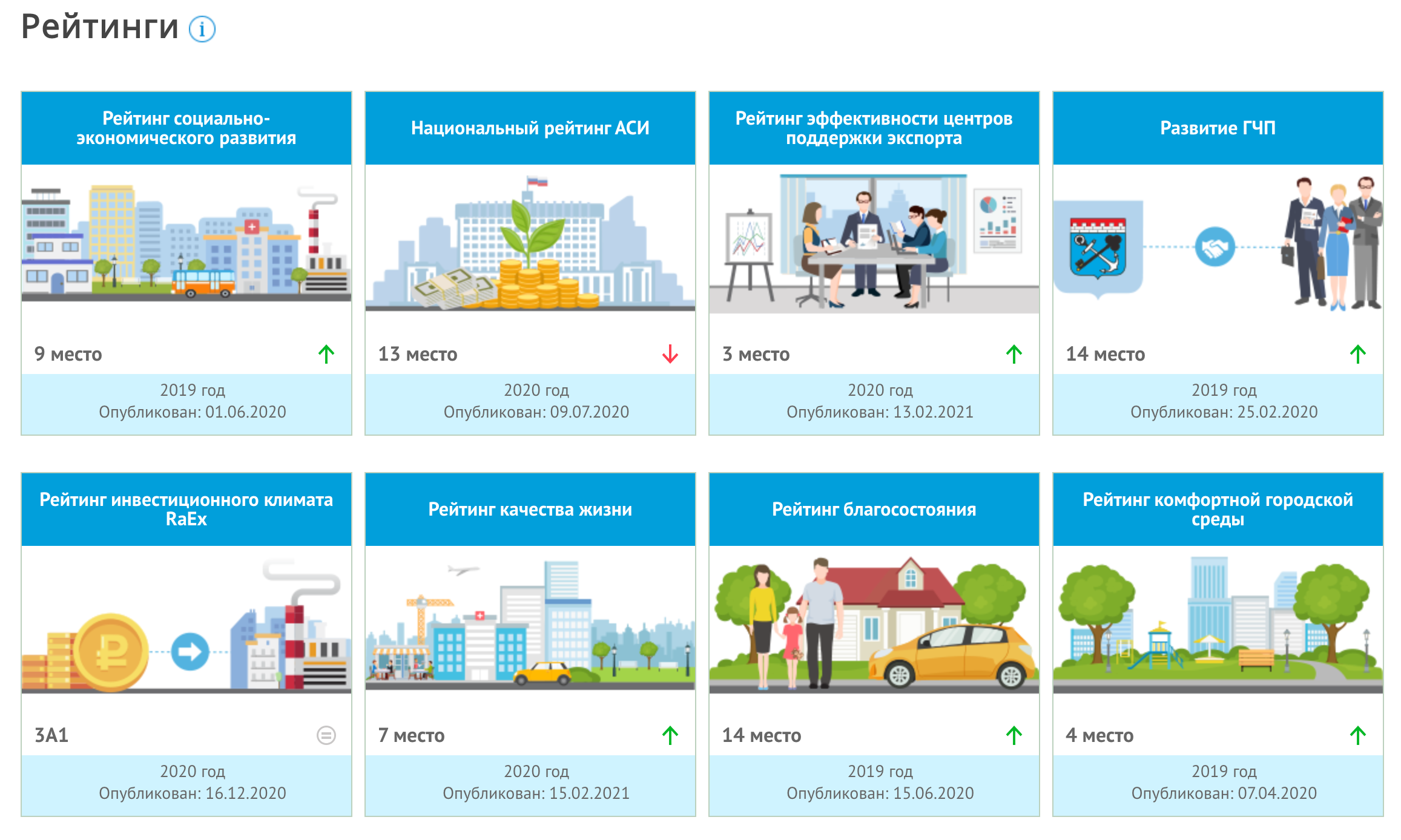 Наилучшая динамика была достигнута по рейтингу регионов по выполнению приоритетного проекта «Формирование комфортной городской среды»: в 2020 году положение региона улучшилось на 14 пунктов. Отрицательная - по национальному рейтингу состояния инвестиционного климата в субъектах Российской Федерации. За 2020 год фиксировалось ухудшение положения на 4 пункта до 13 места.